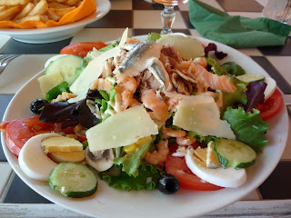 For starters, Frenchie and his parents ordered some fried fish. Being from Texas, I was thinking, “Yummy I love Fish Fry’s!” Hahaha, no catfish here….it was a bowl of teeny little bait fish…I mean…where was the meat? I tried one…and only one…luckily I had the rose to wash down the fried mini fish skin stuck in my teeth…..I will try a food once…but for this food, once was enough. I mean, you know its bad when you use wine as a chaser for food! hahahaha.